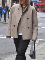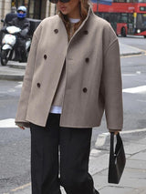 This short women’s jacket features a structured design with a stand-up collar and double-button front, offering a clean and modern profile. The cut and minimal detailing allow it to transition easily between casual and semi-formal settings. Its short length supports flexible styling, whether worn with trousers, skirts, or dresses.