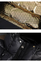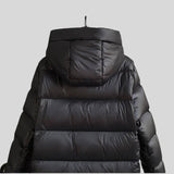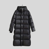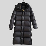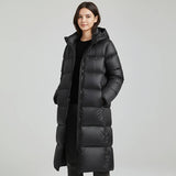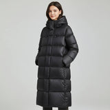 WOMEN'S LONG BLACK PUFFER JACKET FOR WINTER CAMPING SPECS