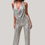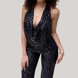 This sequin halter jumpsuit features a flattering silhouette with a draped neckline and flowing wide-leg design. Perfect for formal events, its structured shape offers a polished, balanced appearance suitable for a variety of occasions.