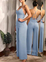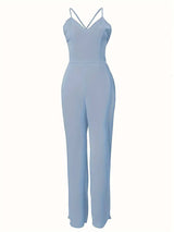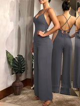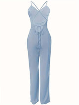 Women's Solid Criss Cross Tie Backless Cami Jumpsuit, Sleeveless Straight Leg Jumpsuit