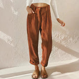 These women’s pants feature a loose leg profile and high-rise stretch waistband, built to accommodate varied daily activities. The structure supports regular use across casual settings with a form that allows flexible wear throughout the day.