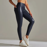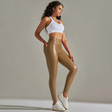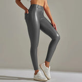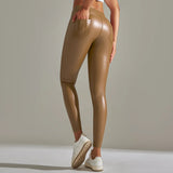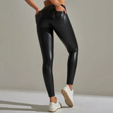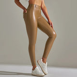 The leggings feature a shiny surface that adds a modern appearance. This finish makes them suitable for both casual wear and styled evening outfits.