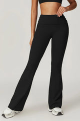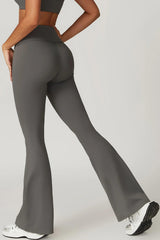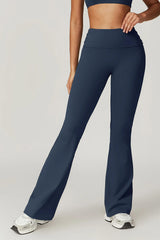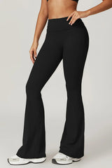 The waistband goes up past your belly button, giving you that nice held in feeling. The fabric stretches in every direction, so you can bend and move without feeling stuck. The flared legs make your shape look balanced while letting you move freely.