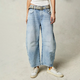 These vintage-inspired jeans feature a mid-waist cut with a wide-leg design and cropped length, perfect for a casual, relaxed look. The boyfriend fit adds a modern touch to classic straight-leg jeans, making them a versatile addition to any wardrobe.