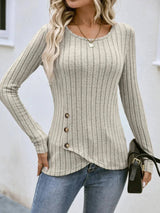 THREE DECORATIVE SIDE BUTTONS: Adds visual interest and a slimming wrap effect that elevates the look beyond basic tops.