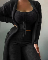- 3‑piece coordinating set including top, pants, and coat for complete loungewear styling.