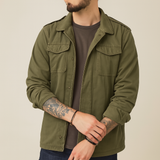 • Classic lapel collar and field-inspired details for a vintage military look.