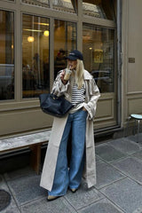 This trench coat is designed with a long silhouette and adjustable waist belt, providing a clean and balanced outline. Its design makes it suitable for layering over both casual and business outfits.
