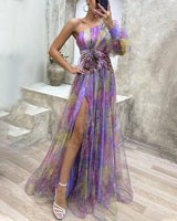 Women’s One-Shoulder Floral Mesh Gown – Elegant Evening Dress for Special Occasions