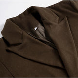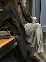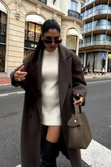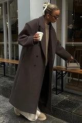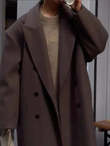 The coat features a refined double-breasted style with a lapel collar and V-neckline, creating a timeless appearance suitable for multiple occasions.