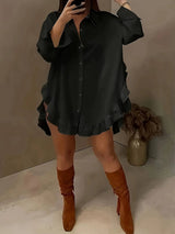 The oversized cut drapes from dropped shoulders to tunic length. Buttons run collar to hem so you decide the opening. Cascading ruffles edge both sleeves and the bottom hem to add movement without bulk or stiffness.